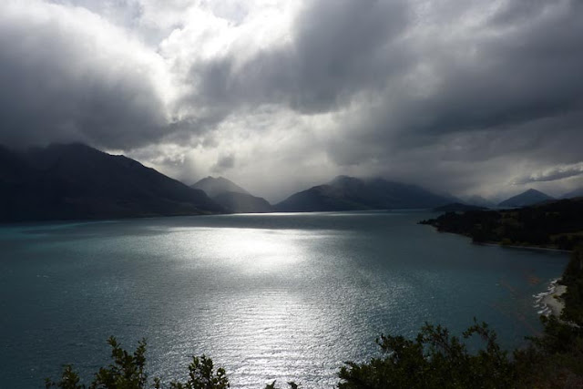 Es hora de volver (nos acostumbraremos a terminar nuestras jornadas sobre las 5-6 de la tarde) y continuar admirando los paisajes que dejamos a nuestras espaldas. Volveremos a parar durante el camino y contemplaremos plasmados cómo los rayos del sol aprovechan cualquier mínimo resquicio de las nubes para ser reflejados en las claras aguas del lago Wakatipu.