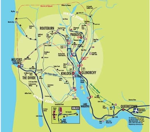 Esos caminos serían los escogidos para dar agradables paseos por la zona. Si lo que queremos es subir montaña lo tenemos fácil porque estamos rodeados de ellas aunque lo que verdaderamente nos atraerá será las diferentes travesías. A unos 40 kilómetros se da la salida a la Routeburn track, una de la más solicitada junto con el Kepler track (salida desde Te Anau) o el Milford track. Todos los tracks (travesías de varios días) hay que reservarlos con antelación, ya sea para poder acampar o para dormir en sus refugios. Todos menos el de Milford, el cual suele tener 2 meses de espera y donde la única posibilidad es pasar la noche en el refugio pues no dejan acampar con tienda de campaña.