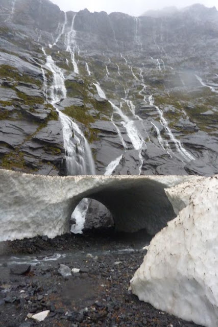 A la altura del Homer tunnel (uno de los pocos túneles de toda Nueva Zelanda, sino el único) es donde podemos andar bajo un gigante bloque de hielo. Aunque si os fijáis en las imágenes anteriores, las diferencias son bastante notorias. Con lluvia un río nos bloqueará el paso así que no siempre podremos andar bajo sus dominios.