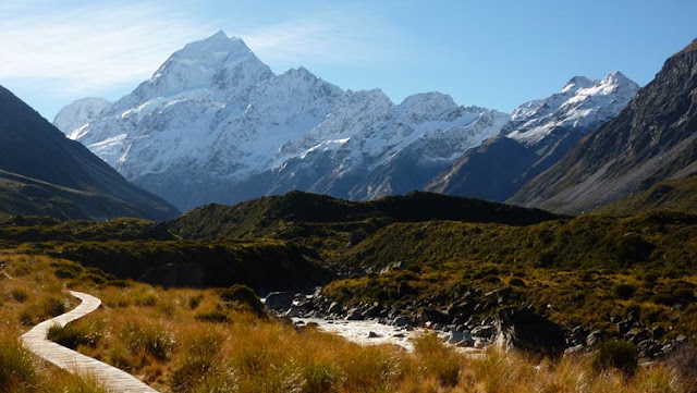A través de otra carretera, ésta asfaltada, podemos acceder a un track de 30 minutos (ida) llamado Kea Lookout. Yo no tuve la suerte de volver a ver este papagayo pero al estar el mirador al pie de las montañas que antes os he presentado puede decirse que no estamos perdiendo el tiempo. De todas formas, el recorrido verdaderamente interesante (también se accede por la misma calzada) es el Hooker Valley track al que corresponden las dos últimas imágenes con Aoraki al fondo. La duración es de unas 3-4 horas la ida y vuelta acabando el trayecto donde muere el Hooker Glaciar en un paseo llano en su totalidad.